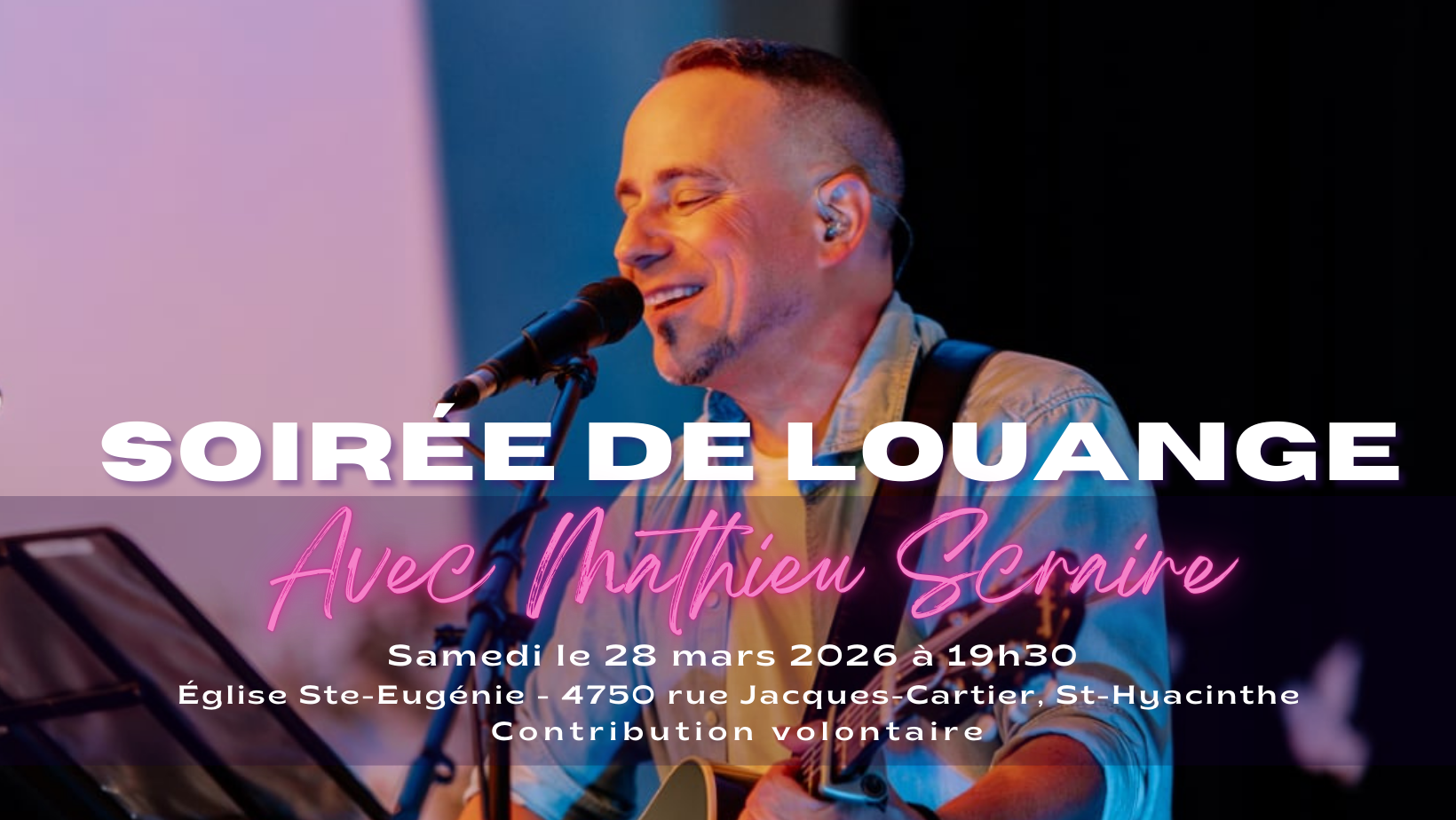 Mercredi saint / Messe chrismale (1er avril 2026) 19 h 30 en la Cathédrale Saint-Hyacinthe-le-Confesseur Jeudi saint (2 avril 2026) 19 h en la Cathédrale Saint-Hyacinthe-le-Confesseur Vendredi saint (3 avril 2026) 15 h en la Cathédrale Saint-Hyacinthe-le-Confesseur 18 h 30 Marche du Pardon (Cathédrale de Saint-Hyacinthe) Samedi saint (4 avril 2026) 20 h Veillée pascale en la Cathédrale Saint-Hyacinthe-le-Confesseur Pâques (dimanche le 5 avril 2026) 9 h en l'église Sainte-Rosalie 9 h en l'église Précieux-Sang 9 h 30 en la Cathédrale Saint-Hyacinthe-le-Confesseur 10 h 30 en l'église Saint-Thomas-d'Aquin 10 h 30 en l'église Sainte-Eugénie 11 h en l'église Notre-Dame-du-Très-Saint-Sacrement 17 h en la Cathédrale Saint-Hyacinthe-le-Confesseur Affiches Marche du Pardon Horaire de la Semaine sainte Programa de Semana Santa